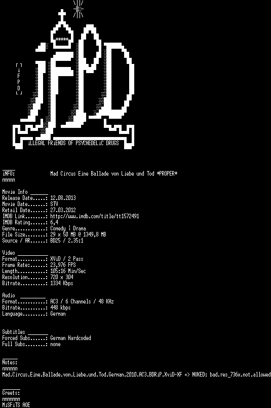 | FiLENAME: | Mad.Circus.Eine.Ballade.von.Liebe.und.Tod.2010.German.AC3.BDRiP.XViD.PROPER-iFPD.avi |