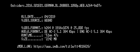 | FiLENAME: | Outsiders.2016.S01E01.GERMAN.DL.DUBBED.1080p.WEB.h264-VoDTv.mkv |