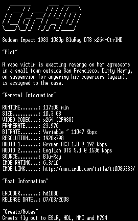 | FiLENAME: | Dirty Harry 4 - Dirty Harry kommt zurück (Sudden Impact) (1983) [DL 1080p BD].mkv |