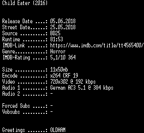 | FiLENAME: | Child.Eater.German.2016.AC3.BDRip.x264-SPiCY.mkv |