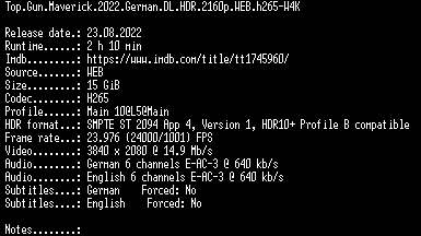 | FiLENAME: | Top.Gun.Maverick.2022.German.DL.HDR.2160p.WEB.h265-W4K.mkv |