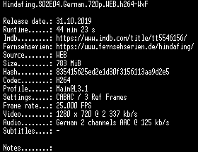 | FiLENAME: | Hindafing.S02E04.German.720p.WEB.h264-WvF.mkv |