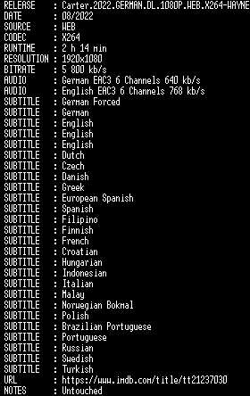 | FiLENAME: | Carter.2022.GERMAN.DL.1080P.WEB.X264-WAYNE.mkv |