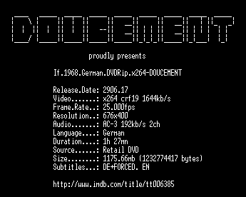 | FiLENAME: | If.1968.German.DVDRip.x264-DOUCEMENT.mkv |