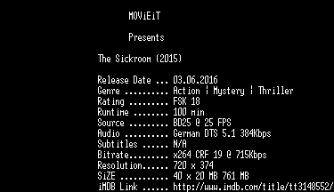 | FiLENAME: | The.Sickroom.German.2015.AC3.BDRip.x264-MOViEiT.mkv |