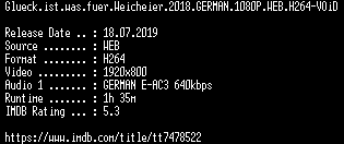 | FiLENAME: | Glueck.ist.was.fuer.Weicheier.2018.GERMAN.1080P.WEB.H264-VOiD.mkv |