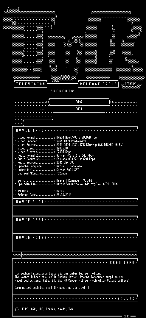 | FiLENAME: | 2046.GERMAN.5.1.DUBBED.DL.AC3.BDRiP.720p.WS.x264-TvR.mkv |
