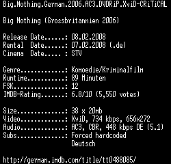 | FiLENAME: | Big.Nothing.German.2006.AC3.DVDRiP.XviD-CRiTiCAL.avi |