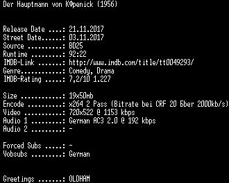 | FiLENAME: | Der.Hauptmann.von.Koepenick.German.REMASTERED.1956.AC3.BDRip.x264-SPiCY.mkv |