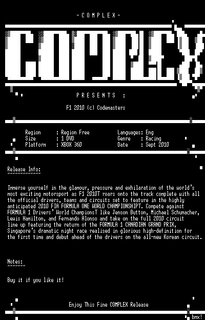 | FiLENAME: | F1.2010.XBOX360-COMPLEX.iso |