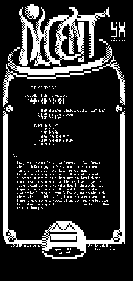 | FiLENAME: | The Resident (2011) [GER-dts 720p BD].mkv |