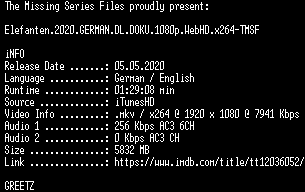 | FiLENAME: | Elefanten.2020.GERMAN.DL.DOKU.1080p.WebHD.x264-TMSF.mkv |