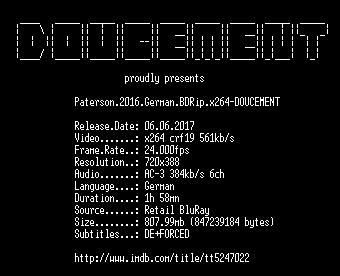 | FiLENAME: | Paterson.2016.German.BDRip.x264-DOUCEMENT.mkv |