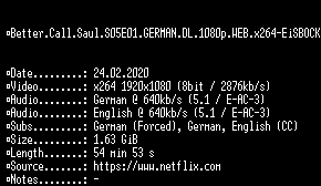 | FiLENAME: | Better.Call.Saul.S05E01.GERMAN.DL.1080p.WEB.x264-EiSBOCK.mkv |