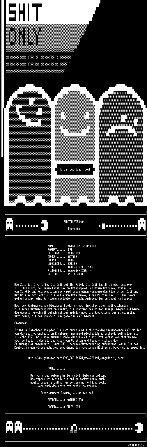 | FiLENAME: | Singularity.GERMAN.REPACK.PAL.XBOX360-SHiTONLYGERMAN.iso |