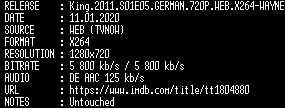 | FiLENAME: | King.2011.S01E05.GERMAN.720P.WEB.X264-WAYNE.mkv |