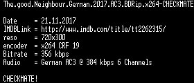 | FiLENAME: | The.good.Neighbour.German.2016.AC3.BDRip.x264-CHECKMATE.mkv |