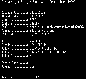 | FiLENAME: | The.Straight.Story.Eine.wahre.Geschichte.German.REMASTERED.1999.AC3.BDRip.x264-SPiCY.mkv |
