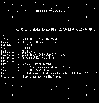 | FiLENAME: | Das.Alibi.Spiel.der.Macht.GERMAN.2017.AC3.BDRip.x264-UNiVERSUM.mkv |