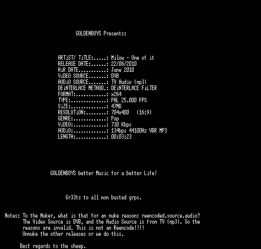 | FiLENAME: | Milow-One_Of_It_READ_NFO-CONVERT-x264-2010-G0ldenB0ys.mkv |