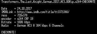 | FiLENAME: | Transformers.The.Last.Knight.German.2017.AC3.BDRip.x264-CHECKMATE.mkv |