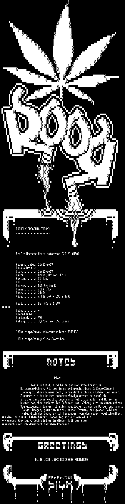 | FiLENAME: | Bro.Machete.Meets.Motocross.German.2012.DVDRiP.x264-ROOR.mkv |