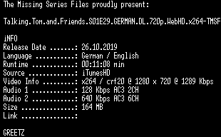 | FiLENAME: | Talking.Tom.and.Friends.S01E29.GERMAN.DL.720p.WebHD.x264-TMSF.mkv |