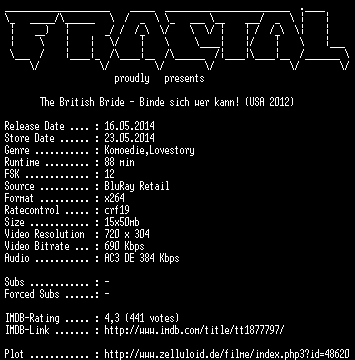 | FiLENAME: | The.British.Bride.Binde.sich.wer.kann.German.2012.BDRip.x264-FRACTAL.mkv |