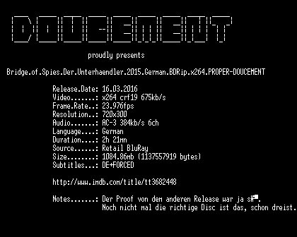 | FiLENAME: | Bridge.of.Spies.Der.Unterhaendler.2015.German.BDRip.x264.PROPER-DOUCEMENT.mkv |