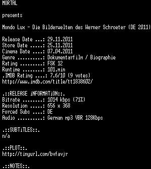 | FiLENAME: | Mondo.Lux.Die.Bilderwelten.des.Werner.Schroeter.German.DVDRip.XviD-MORTAL.avi |