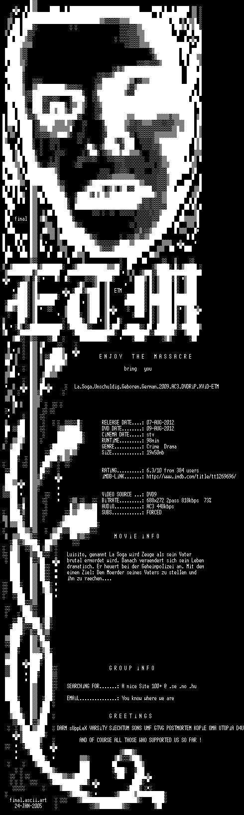 | FiLENAME: | La.Soga.Unschuldig.Geboren.German.2009.AC3.DVDRiP.XViD-ETM.avi |
