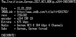 | FiLENAME: | The.Crucifixion.German.2017.AC3.BDRip.x264-CHECKMATE.mkv |