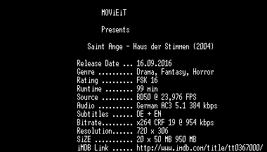| FiLENAME: | Saint.Ange.Haus.der.Stimmen.German.2004.AC3.BDRip.x264-MOViEiT.mkv |