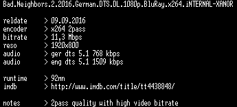 | FiLENAME: | Bad.Neighbors.2.2016.German.DTS.DL.1080p.BluRay.x264.iNTERNAL-XANOR.mkv |
