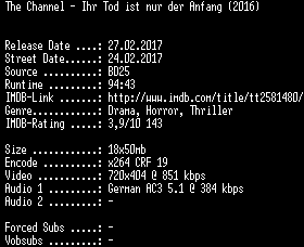 | FiLENAME: | The.Channel.Ihr.Tod.ist.nur.der.Anfang.German.2016.AC3.BDRip.x264-SPiCY.mkv |