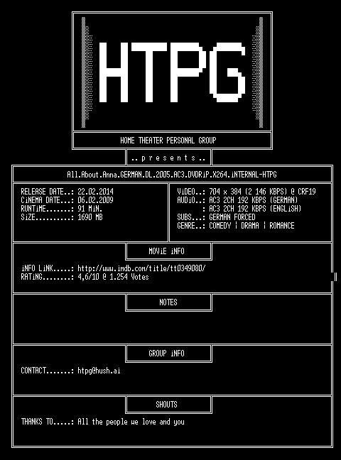 | FiLENAME: | All.About.Anna.GERMAN.DL.2005.AC3.DVDRiP.X264.iNTERNAL-HTPG.mkv |