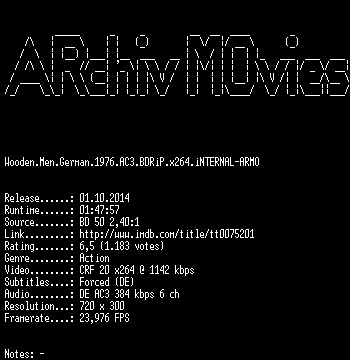 | FiLENAME: | Wooden.Men.German.1976.AC3.BDRiP.x264.iNTERNAL-ARMO.mkv |