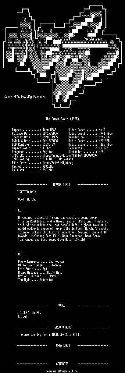 | FiLENAME: | The.Quiet.Earth.1985.WS.DVDRip.XviD-MESS.avi |