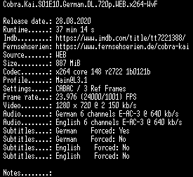 | FiLENAME: | Cobra.Kai.S01E10.German.DL.720p.WEB.x264-WvF.mkv |