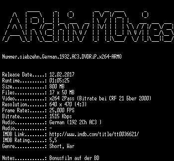 | FiLENAME: | Nummer.siebzehn.German.1932.AC3.DVDRiP.x264-ARMO.mkv |