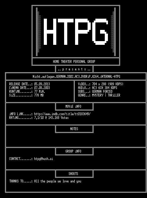 | FiLENAME: | Nicht.auflegen.GERMAN.2002.AC3.DVDRiP.X264.iNTERNAL-HTPG.mkv |