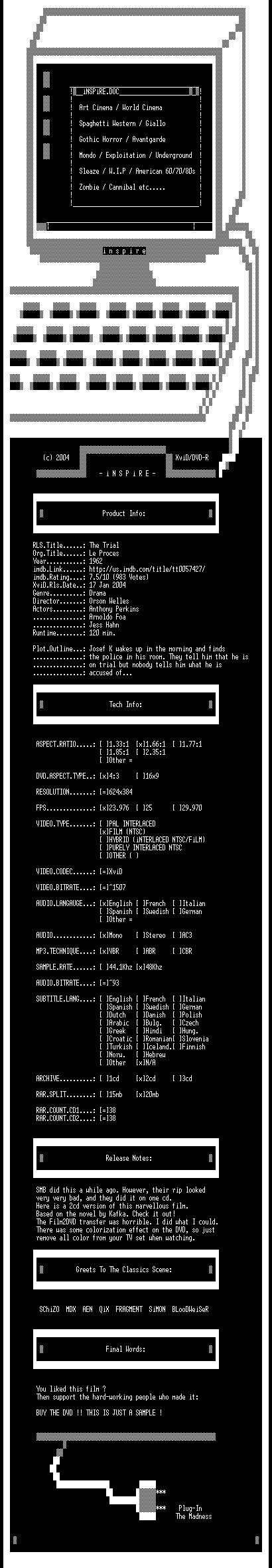 | FiLENAME: | The.Trial.1962.DVDRip.XviD.iNTERNAL-iNSPiRE.CD2.avi |
