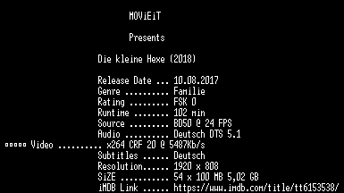 | FiLENAME: | Die.kleine.Hexe.2018.German.1080p.BluRay.x264-MOViEiT.mkv |