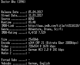| FiLENAME: | Doctor.Who.German.REMASTERED.1996.AC3.BDRip.x264-SPiCY.mkv |