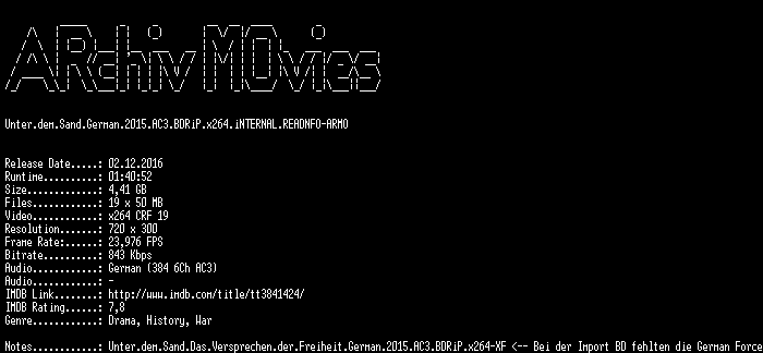| FiLENAME: | Unter.dem.Sand.German.2015.AC3.BDRiP.x264.iNTERNAL.READNFO-ARMO.mkv |