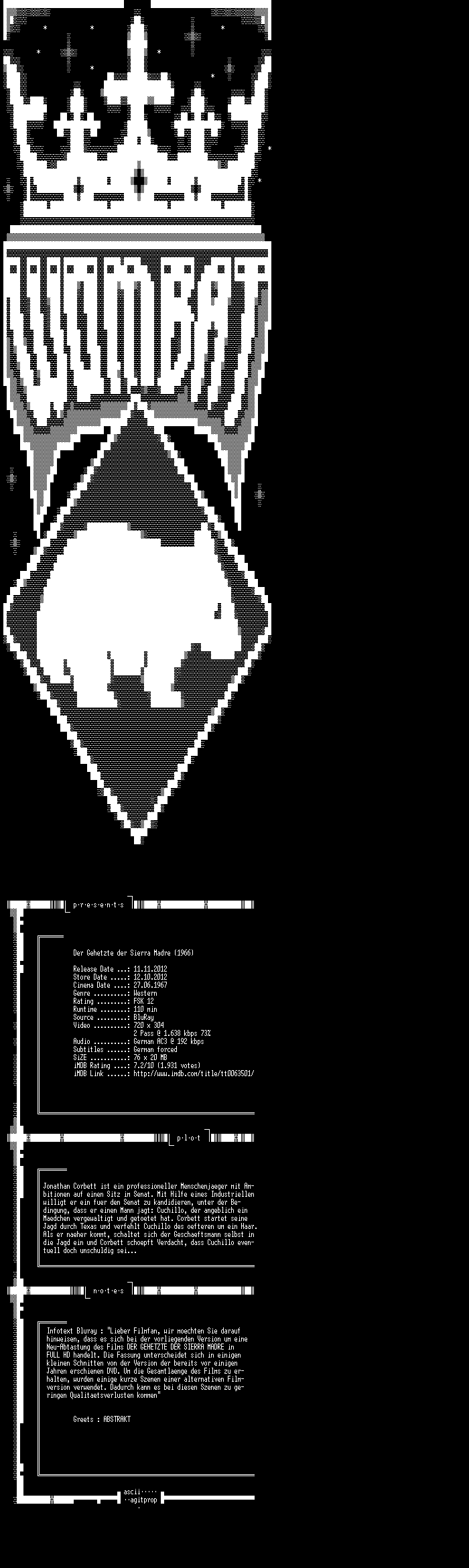 | FiLENAME: | Der.Gehetzte.der.Sierra.Madre.German.1966.AC3.BDRiP.XViD.READ.NFO-WOMBAT.avi |