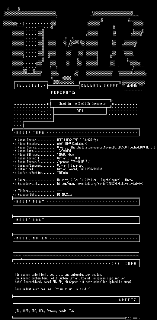 | FiLENAME: | Ghost.in.the.Shell.2.-.Innocence.2004.GERMAN.5.1.DL.DTSMA.ANiME.BDRiP.1080p.WS.x264-TvR.mkv |