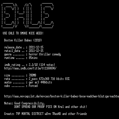 | FiLENAME: | Boston.Killer.Babes.German.2010.AC3.DVDRip.XviD-EHLE.avi |