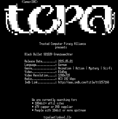 | FiLENAME: | Black.Bullet.S01E09.Grenzwaechter.German.Dubbed.ANiME.720p.BluRay.x264-TCPA.mkv |