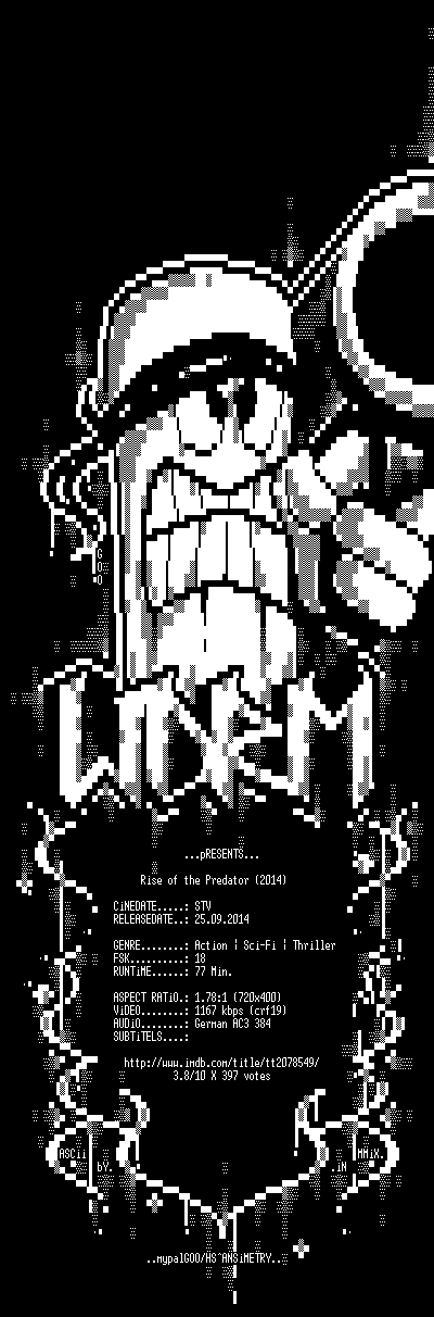 | FiLENAME: | Rise.of.the.Predator.2014.German.AC3.BDRiP.x264-w0rm.mkv |